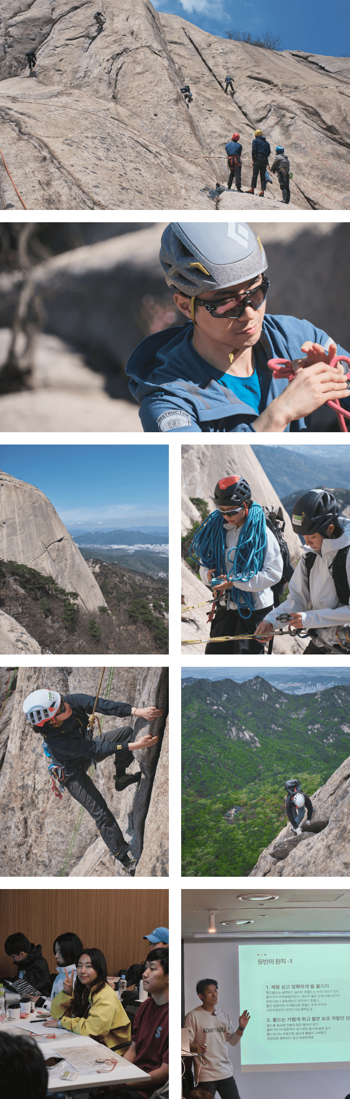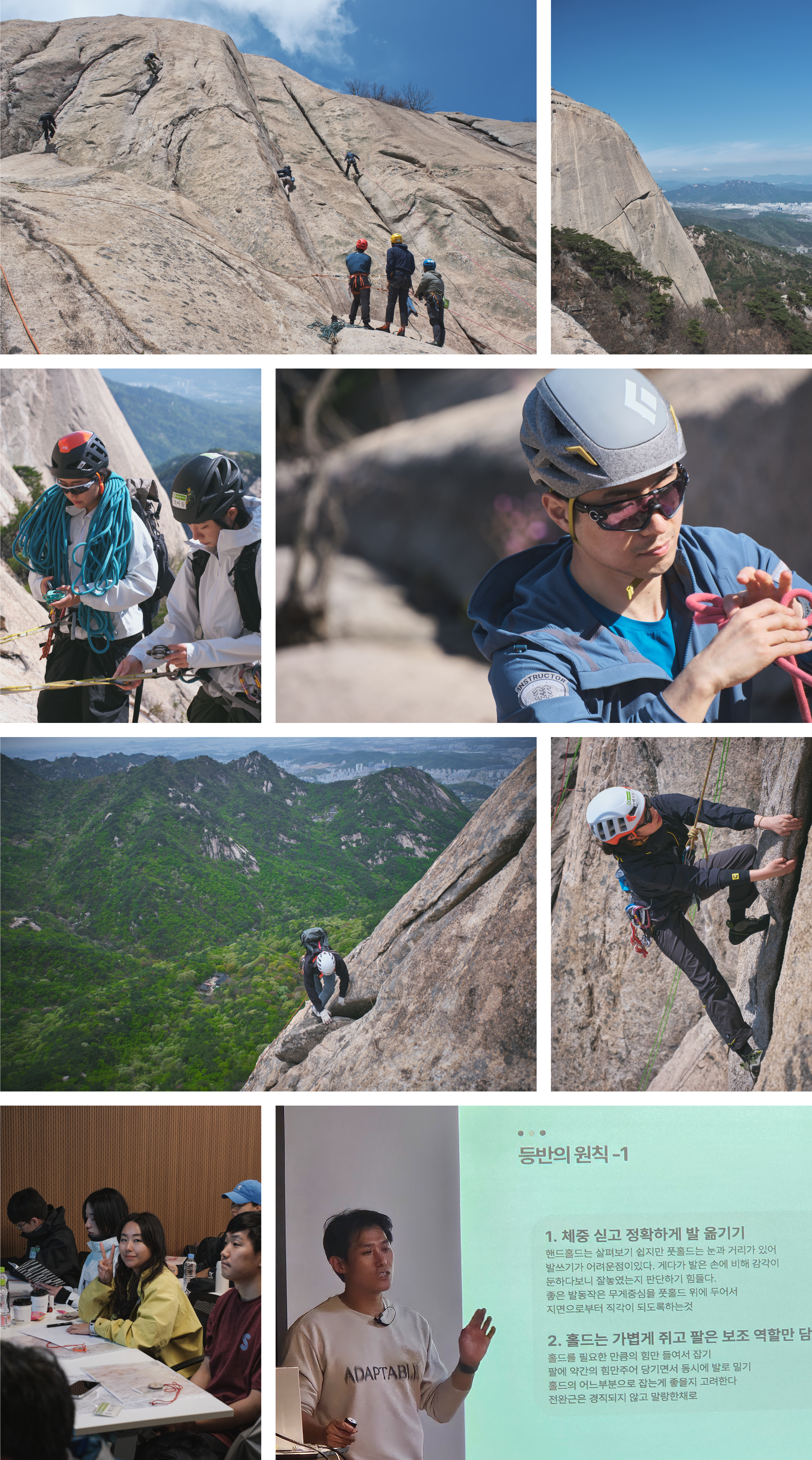 크랙(레이백, 째밍), 페이스, 침니, 스테밍 등반기술, 확보물 이용 회수법, 멀티피치 등반 입문