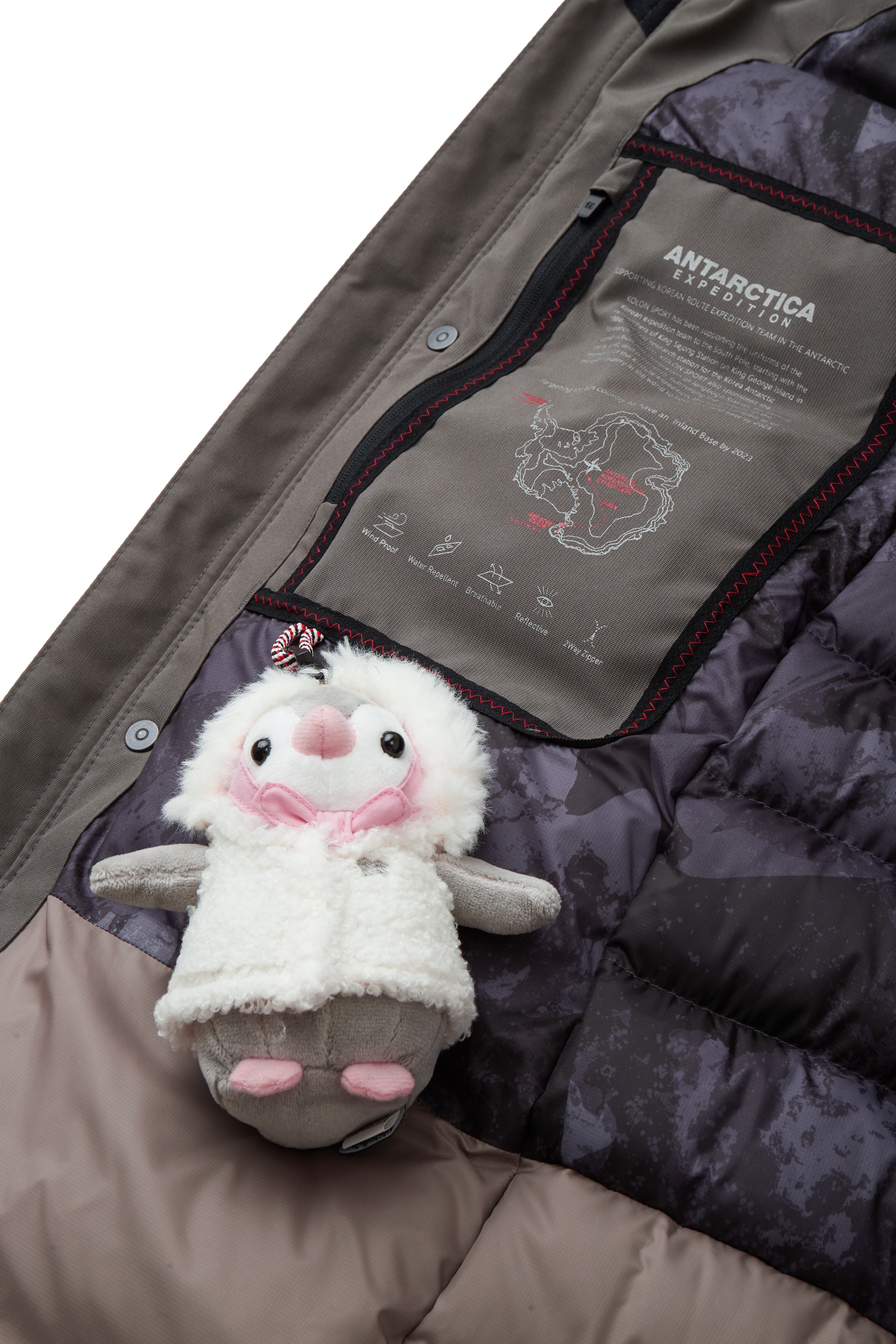 *안타티카 코쿤 다운 안쪽에 있는 귀여운 펭귄인형