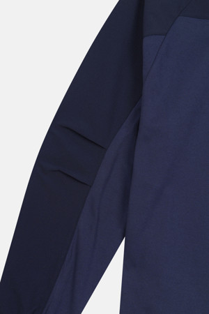 우븐과 저지 소재를 조합한 하이브리드 라운드 맨투맨입니다.